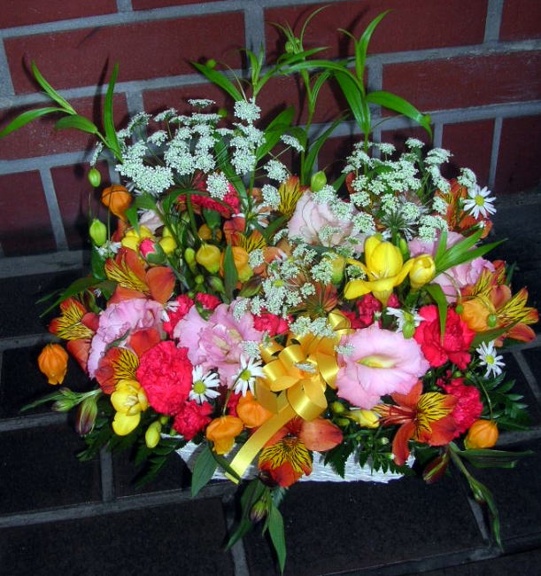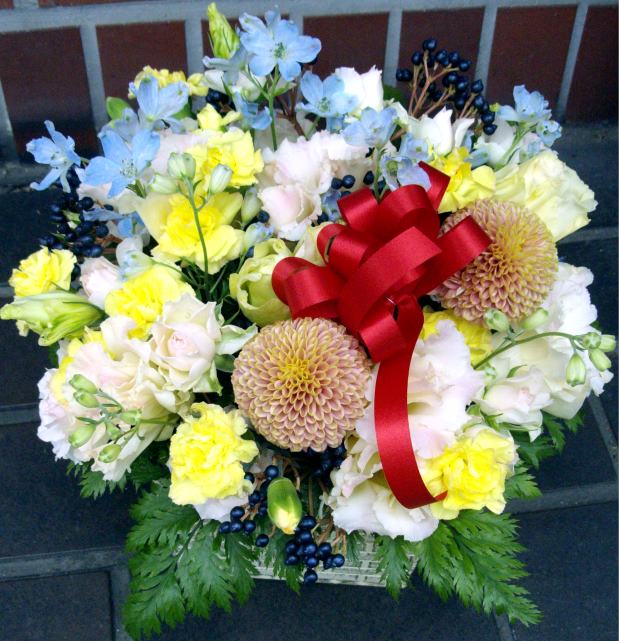 楽屋花や、お誕生日、お見舞い等、どの場面でも重宝します。何にしようか悩む場合は、アレンジがオススメです。季節の花を贈りましょう。可愛らしくや、大胆に、変幻自在なところがアレンジの特長です。 ※注意事項 こちらでご紹介している作品は、過去の11月にお届けした作品例です。 サンプルイメージですので、時期・場合によっては花材が揃わない場合がございますので御了承ください。 サンプル商品写真をクリックして頂くと、大き目の写真が見られます。 サンプルの型番: P(ピンク)Y(黄色)OR(オレンジ)V(紫)B(青)R(赤)の略です。SPはスプレー咲きの略です。例:PSPカーネ・・ピンクスプレーカーネーション |