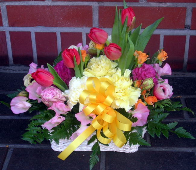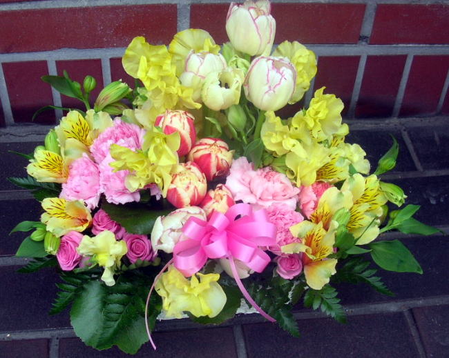 楽屋花や、お誕生日、お見舞い等、どの場面でも重宝します。何にしようか悩む場合は、アレンジがオススメです。季節の花を贈りましょう。可愛らしくや、大胆に、変幻自在なところがアレンジの特長です。 ※注意事項 こちらでご紹介している作品は、過去の03月にお届けした作品例です。 サンプルイメージですので、時期・場合によっては花材が揃わない場合がございますので御了承ください。 サンプル商品写真をクリックして頂くと、大き目の写真が見られます。 サンプルの型番: P(ピンク)Y(黄色)OR(オレンジ)V(紫)B(青)R(赤)の略です。SPはスプレー咲きの略です。例:PSPカーネ・・ピンクスプレーカーネーション |